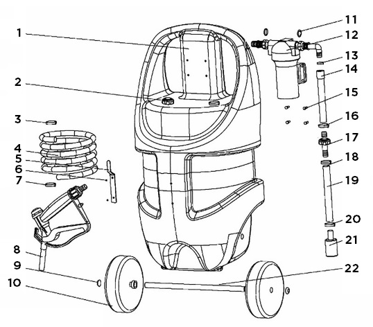 Un tuyau de refoulement EPDM de 4 mètres, résistant aux agents chimiques, est monté avec un pistolet manuel ergonomique et un support de rangement intégré pour plus de propreté et de praticité.