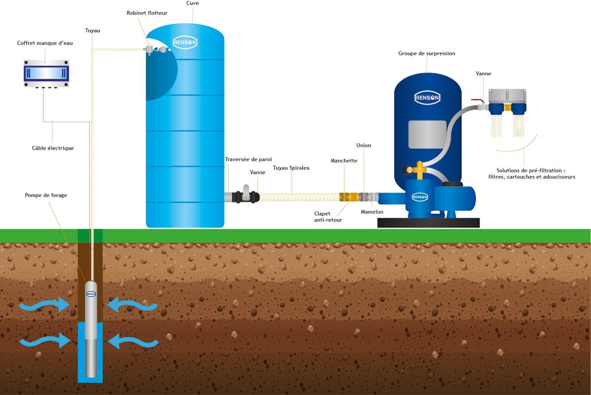 Pompe de forage de diamètre 4’’ 250 l/min à bain d'eau triphasée 4kW pour usages industriels ou agricoles (hydraulique + moteur à bain d'eau)