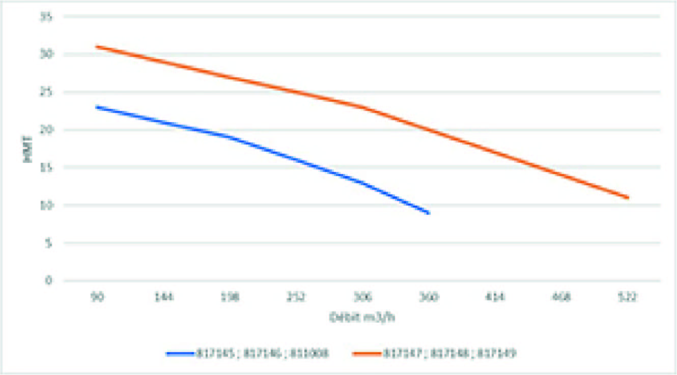 Débit : | 90 m3/h = HMT 23 360 m3/h = HMT 9 |