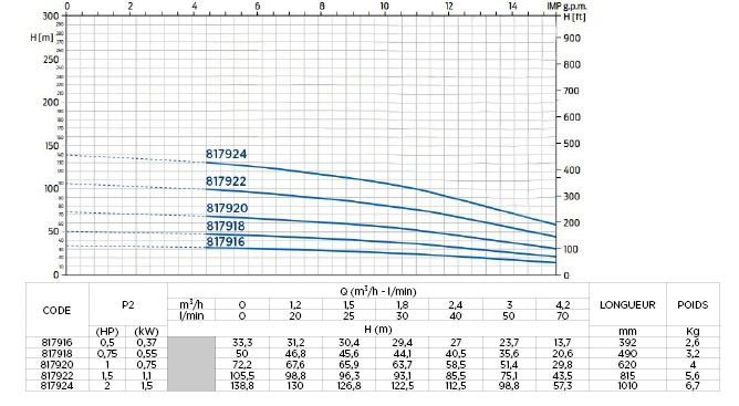 - Débit maximum (Q): 4.2 m3/h ; 70 l/min