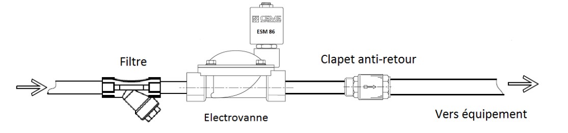 Les électrovannes ne font pas office de clapet anti-retour. Un électrovanne NF au repos peut être traversée par un débit à contre flux. Prévoir dans ce cas l'installation d'un clapet anti-retour.