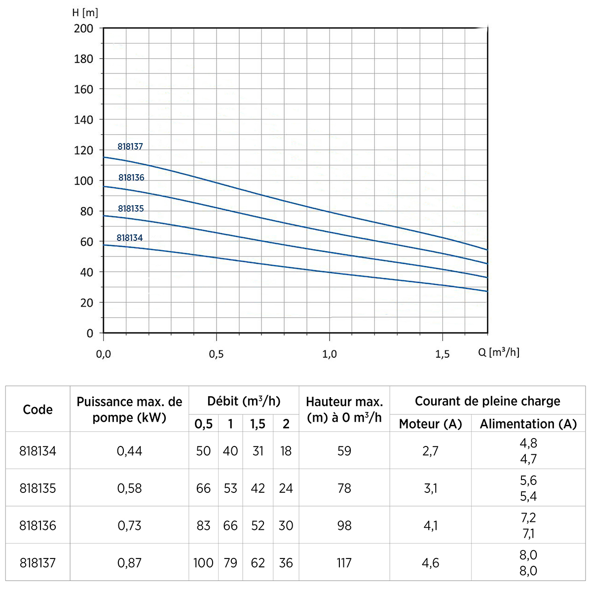 - Adapté pour de l’eau claire, exemptes de particules solides, d’une teneur en sable allant jusqu’à 150 gr/m³ maximum
