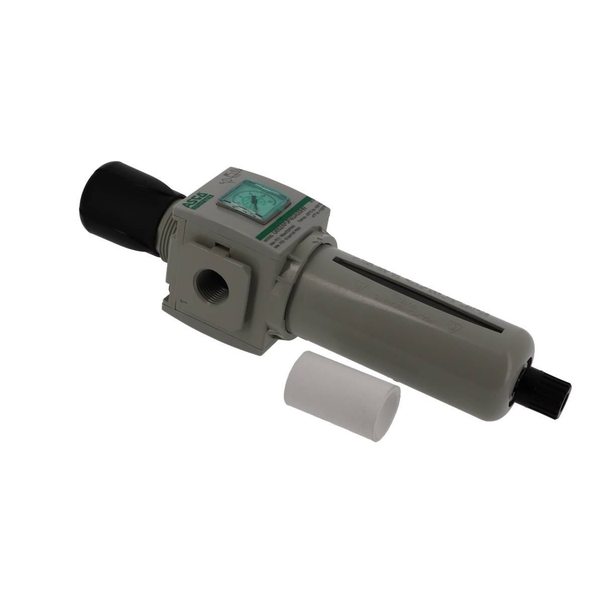 Filtre régulateur permettant de fournir aux outils pneumatiques un air épuré et régulé. A placer en sortie du compresseur ou sur le circuit alimentant des outils ne devant pas être lubrifiés.