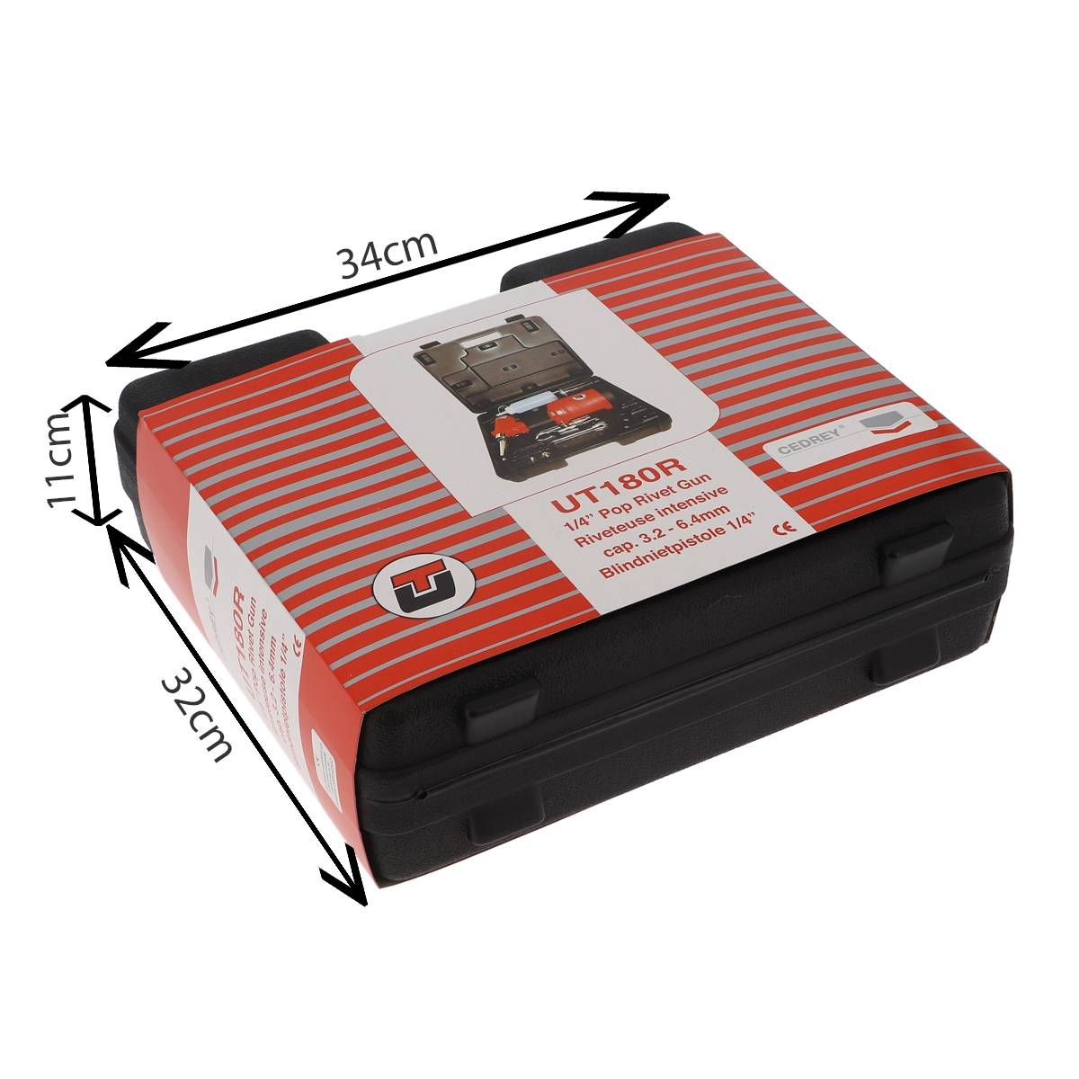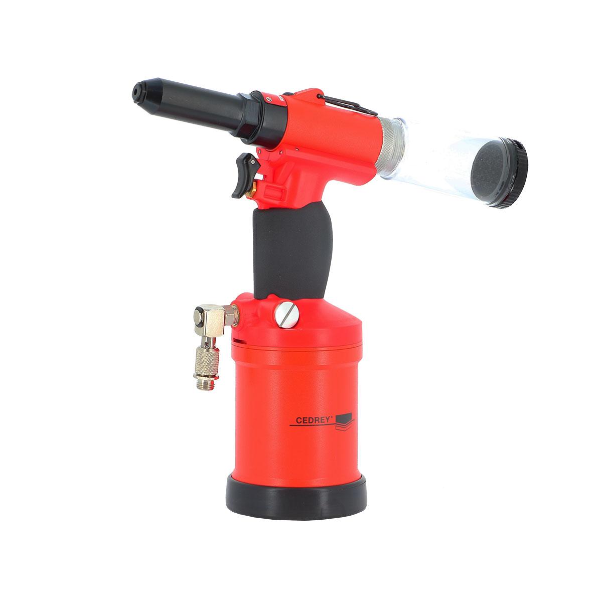 "Etudiée pour fonctionner avec des rivets aveugles ""pop"" en alu, cuivre, acier & inox jusqu'à 6.4 mm. Nombreux points forts: carter composite robuste et léger, silencieux incorporé, poignée gainée, raccord d'admission tournant, système venturi maintenant automatiquement le rivet dans le porte embout & facilitant ainsi grandement le travail vers le bas, soupape de sécurité et aspiration automatique des clous dans le bocal de récupération. Livrée en coffret avec manuel et clés de service."Informations complémentaires :