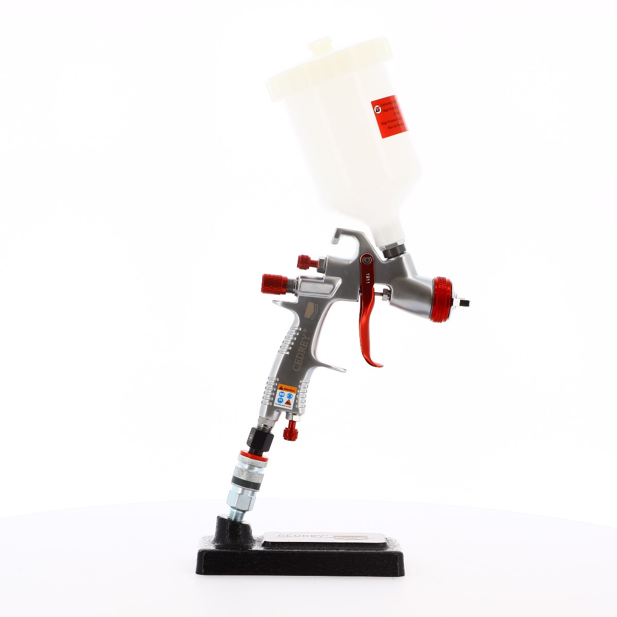 "Pistolet à gravité, sa buse ainsi que son aiguille en acier inoxydable le rendent bien adapté aux peintures et vernis hydrosolubles. Corps en aluminium et godet en plastique lui confèrent légèreté et solidité. Réglage du débit d'air, du débit de produit et de la forme du jet par 3 molettes.ACCESSOIRES CONSEILLÉS